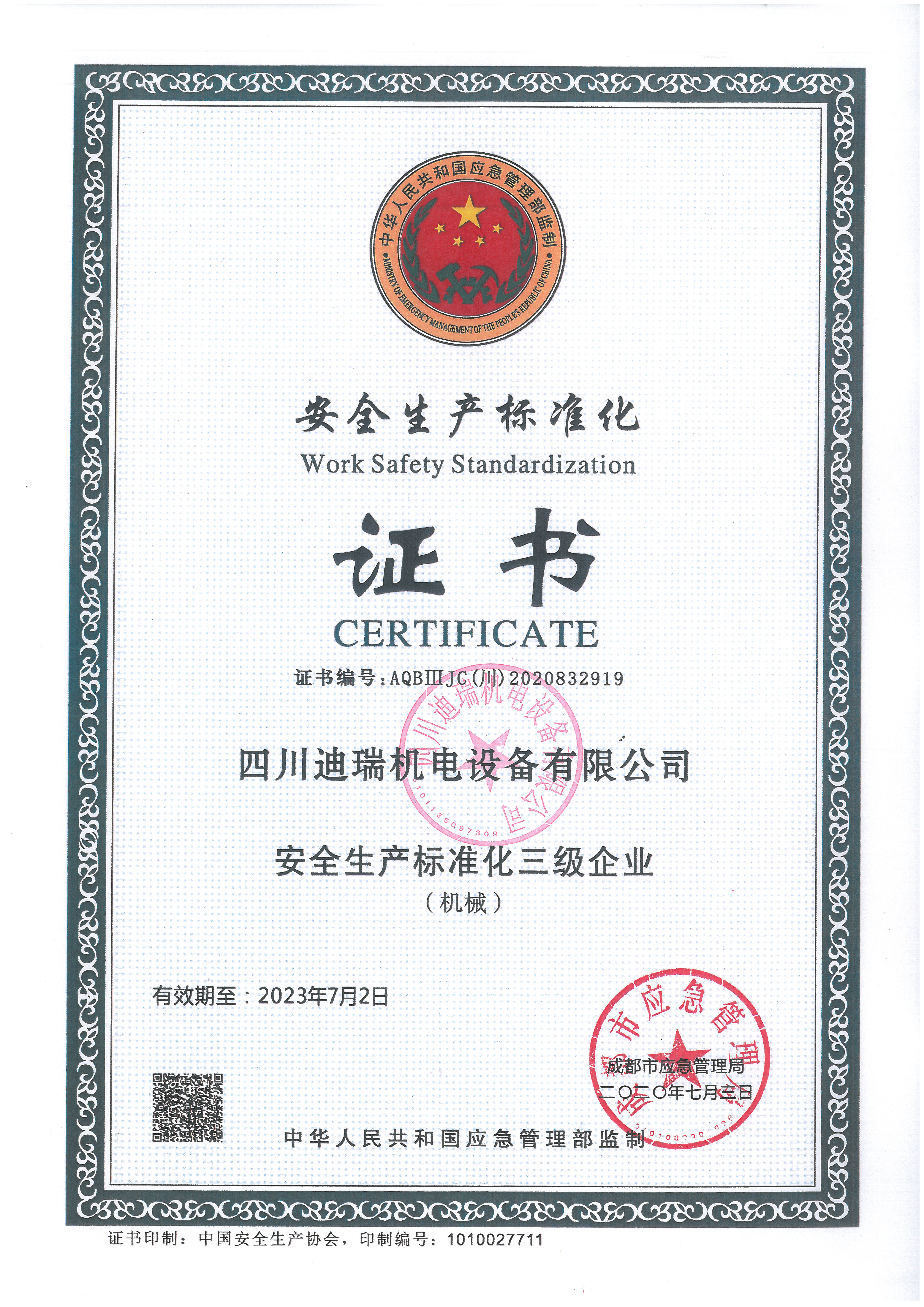 安全生產(chǎn)標(biāo)準(zhǔn)化證書